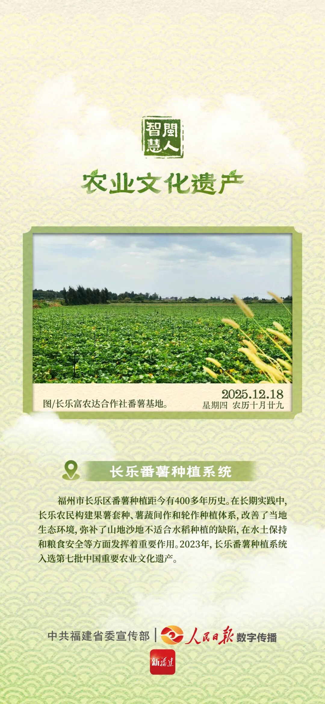 福州市长乐区番薯种植距今有400多年历史。在长期实践中,长乐农民构建果薯套种、薯蔬间作和轮作种植体系,改善了当地生态环境,弥补了山地沙地不适合水稻种植的缺陷,在水土保持和粮食安全等方面发挥着重要作用。2023年,长乐番薯种植系统入选第七批中国重要农业文化遗产。