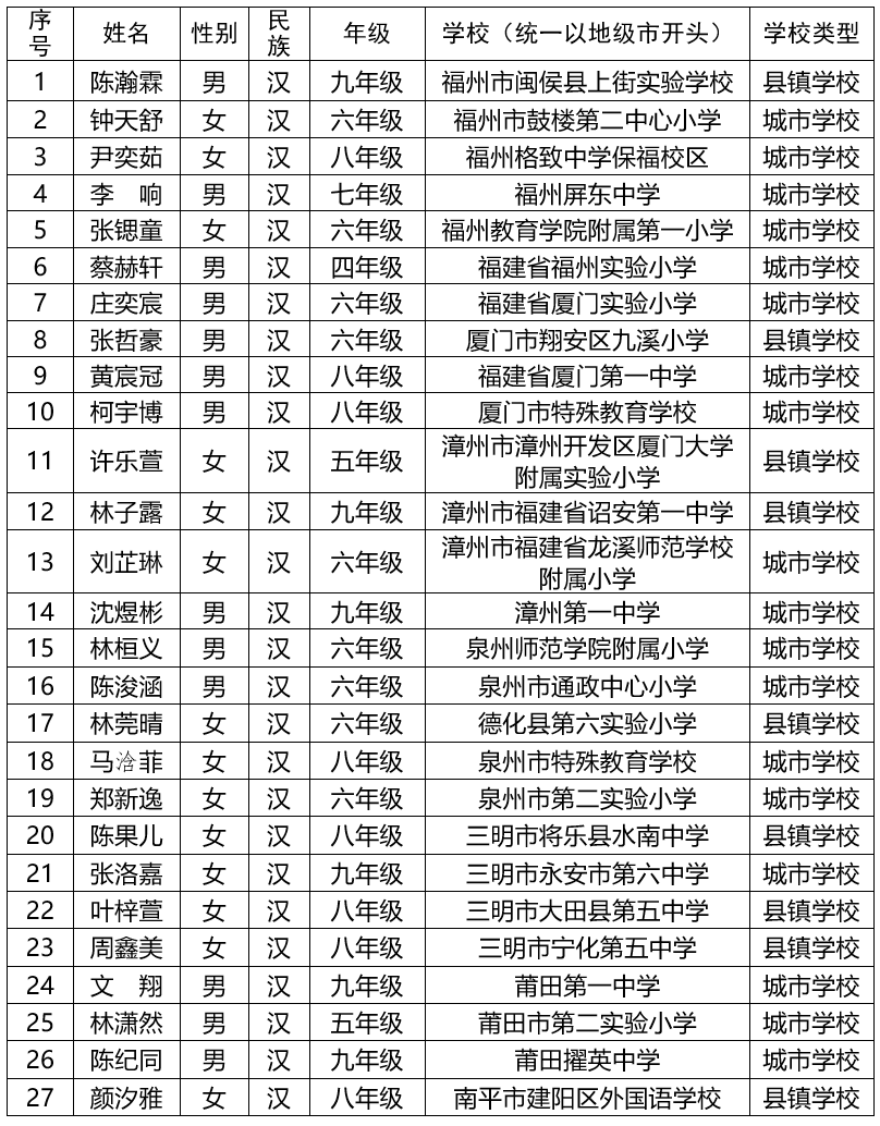 根据《教育部办公厅关于第十七届宋庆龄奖学金评选工作的通知》(教基厅函〔2025〕28号)《福建省教育厅办公室关于做好第十七届宋庆龄奖学金评选工作的通知》(闽教办思〔2025〕3号)文件要求,在各地申报的基础上,经资格审查、专家评审等程序,共评选出福建省第十七届宋庆龄奖学金候选人36名,拟将候选人名单推荐至宋庆龄奖学金办公室。现予以公示。