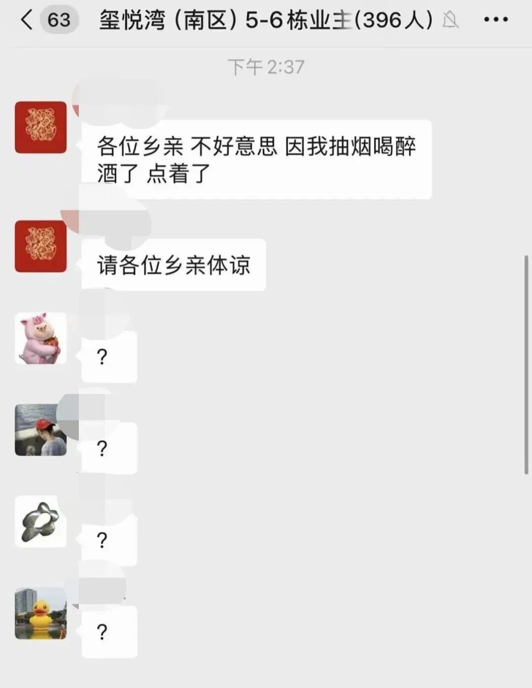 下午2点37分,又流传出一张聊天截图,宣传“烧房子”业主表示:各位乡亲 ,不好意思,因我抽烟喝醉酒了,点着了,请各位乡亲体谅。