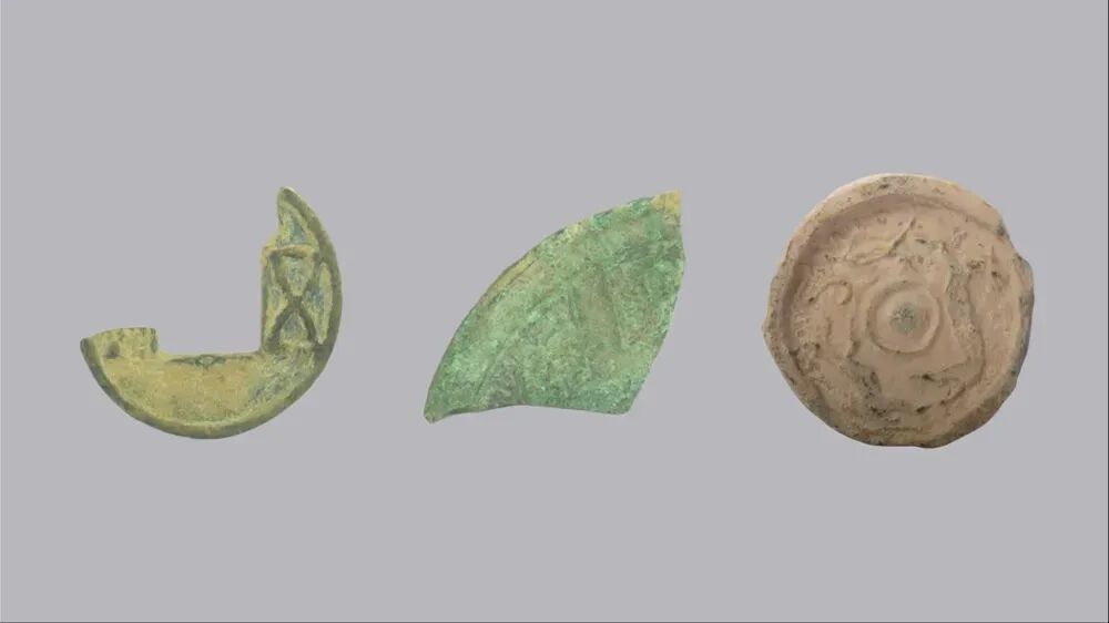 依次为遗址出土的铜钱、铜镜残片和动物纹瓦当