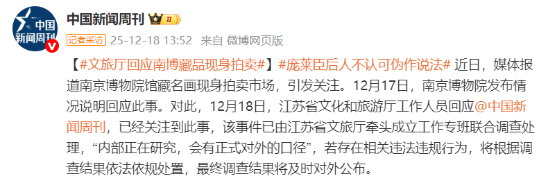 12月17日,南京博物院发布情况说明回应此事。对此,12月18日,江苏省文化和旅游厅工作人员回应@中国新闻周刊,已经关注到此事,该事件已由江苏省文旅厅牵头成立工作专班联合调查处理,“内部正在研究,会有正式对外的口径”,若存在相关违法违规行为,将根据调查结果依法依规处置,最终调查结果将及时对外公布。