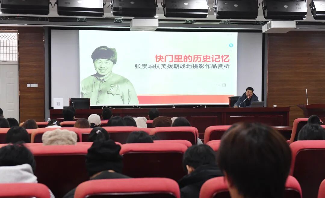讲座中,100余张从未或极少公开的战地照片逐一亮相,带领师生穿越到战火纷飞的年代,深刻感受战争的残酷、先烈的赤胆忠诚与和平生活的来之不易。除了红色历史解读,许国还以专业从业者的身份,围绕“怎么看、怎么拍、拍什么”三个核心问题,为摄影爱好者带来实用技巧指导。他分享,摄影从来不是单纯的技术操作,更是责任与担当的表达,摄影工作者应坚守“以影像为笔,为时代立传”的初心,用镜头捕捉真实、传递温暖、弘扬正气。