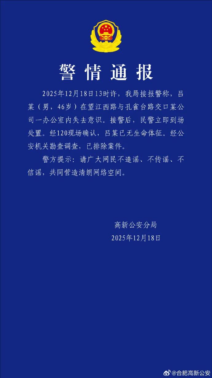 编辑 王斌 校对 李怀英 审核 饶竹舟 来源 合肥高新公安、财联社、新京报等