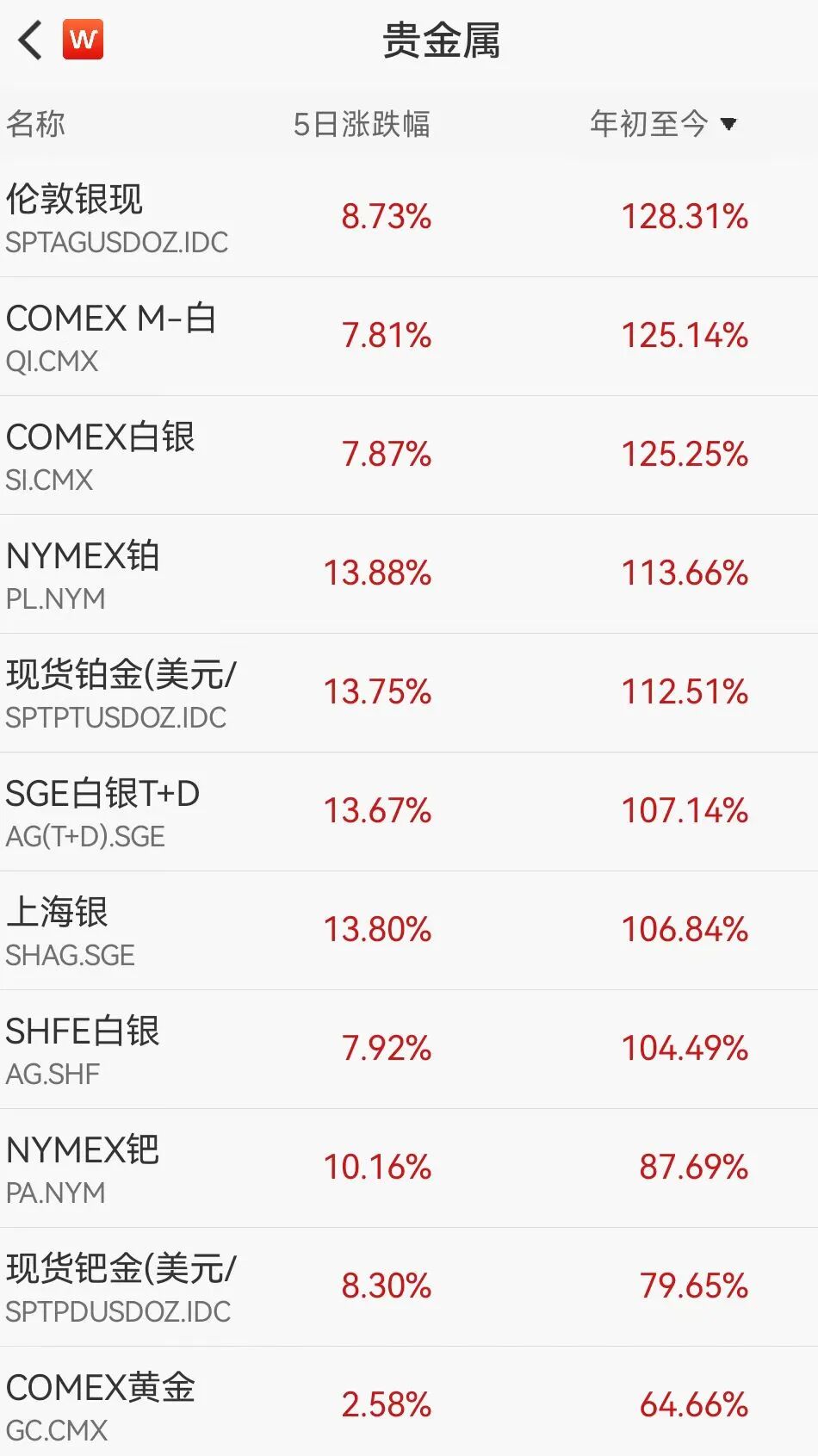 截至12月17日19:53,年内涨幅靠前贵金属品种排行,白银以128%涨幅领先贵金属板块,铂金涨幅113%。