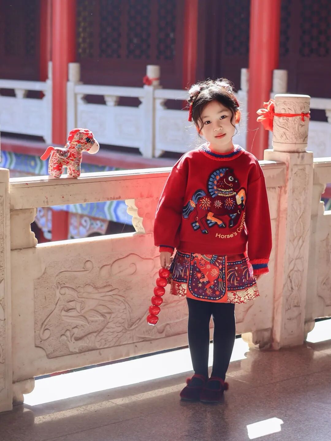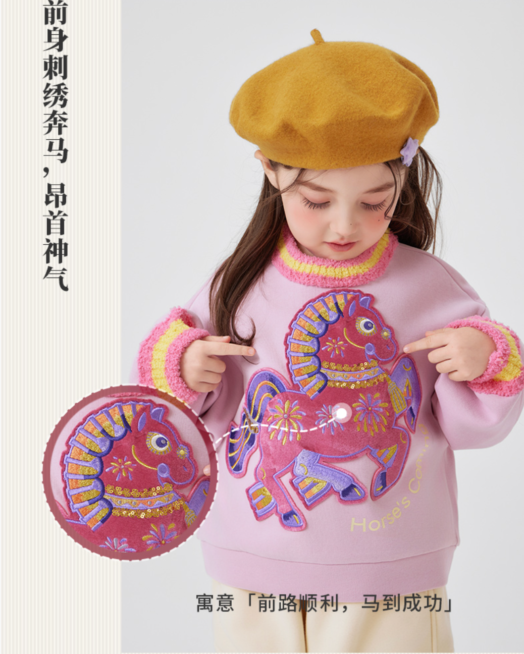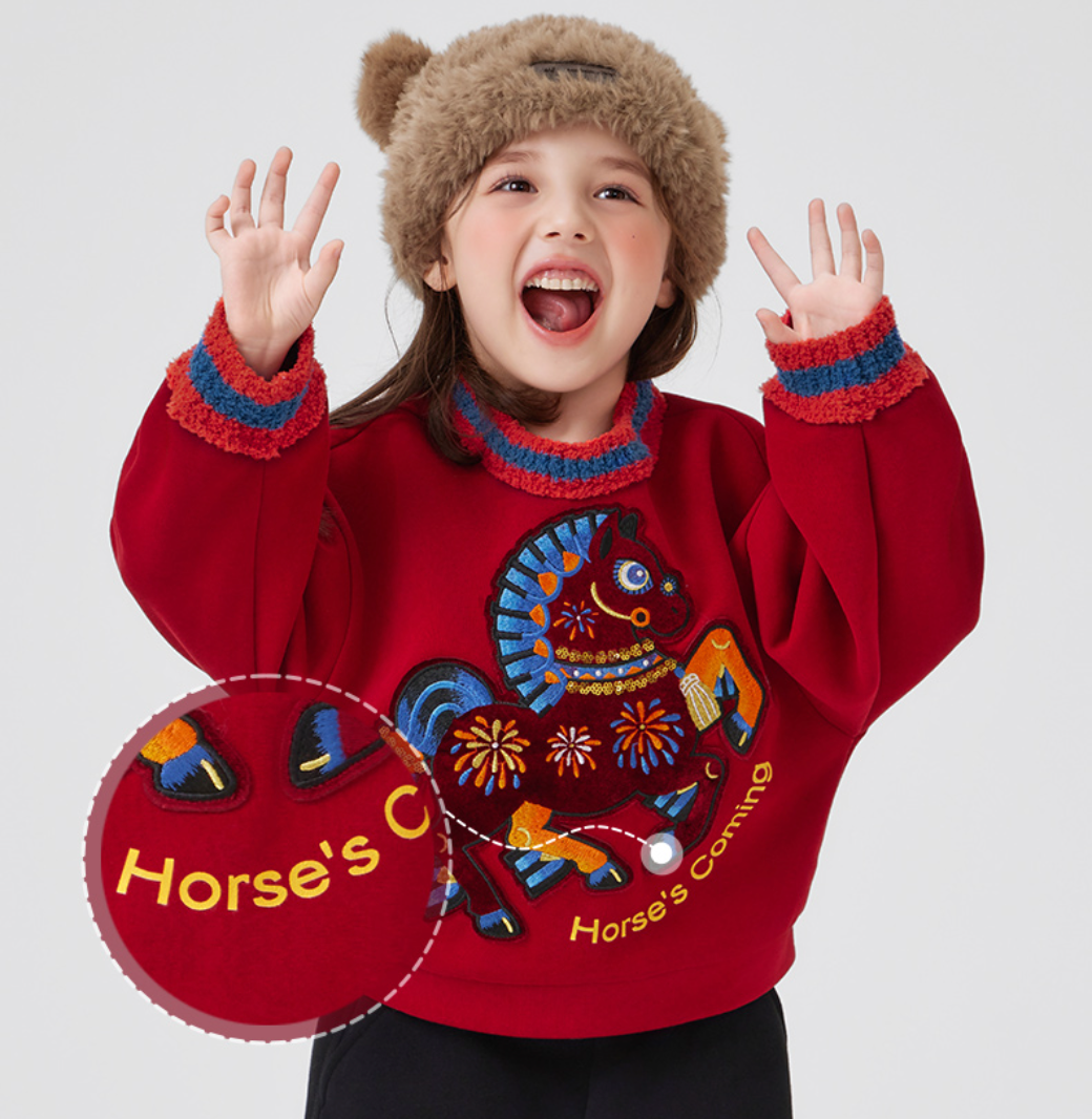 “利马出发”亲子卫衣,昂首前奔的刺绣骏马是点睛,寓意“前路顺利,马到成功”,呼应英文“Horse's Coming”,中文谐音“好事到来”,巧妙融合吉祥寓意与潮流态度。