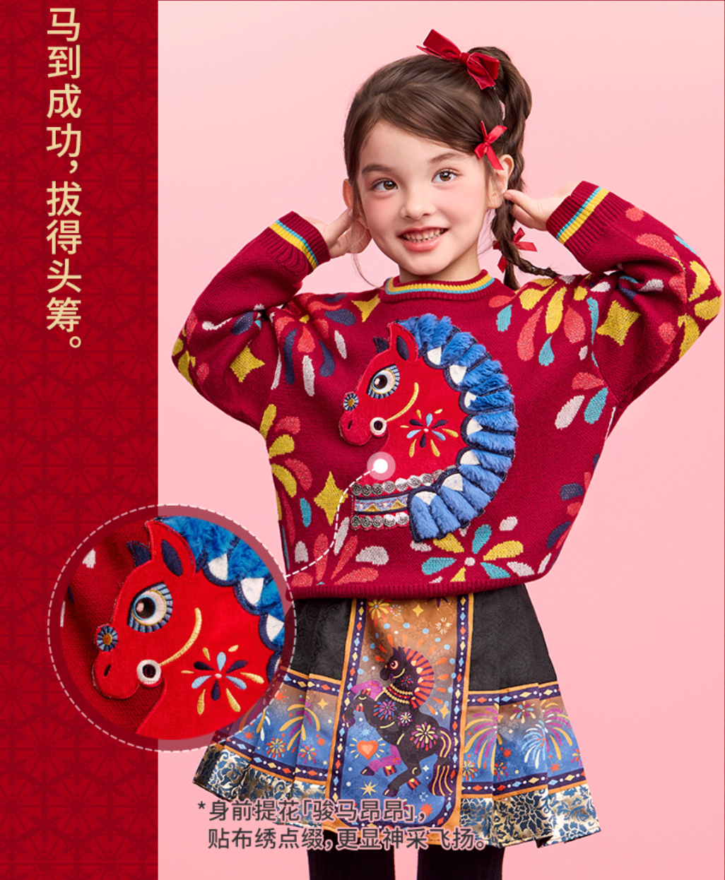 这款毛衣的卖点,尽在身前这幅灵动的“盛世乐马”提花画卷中。