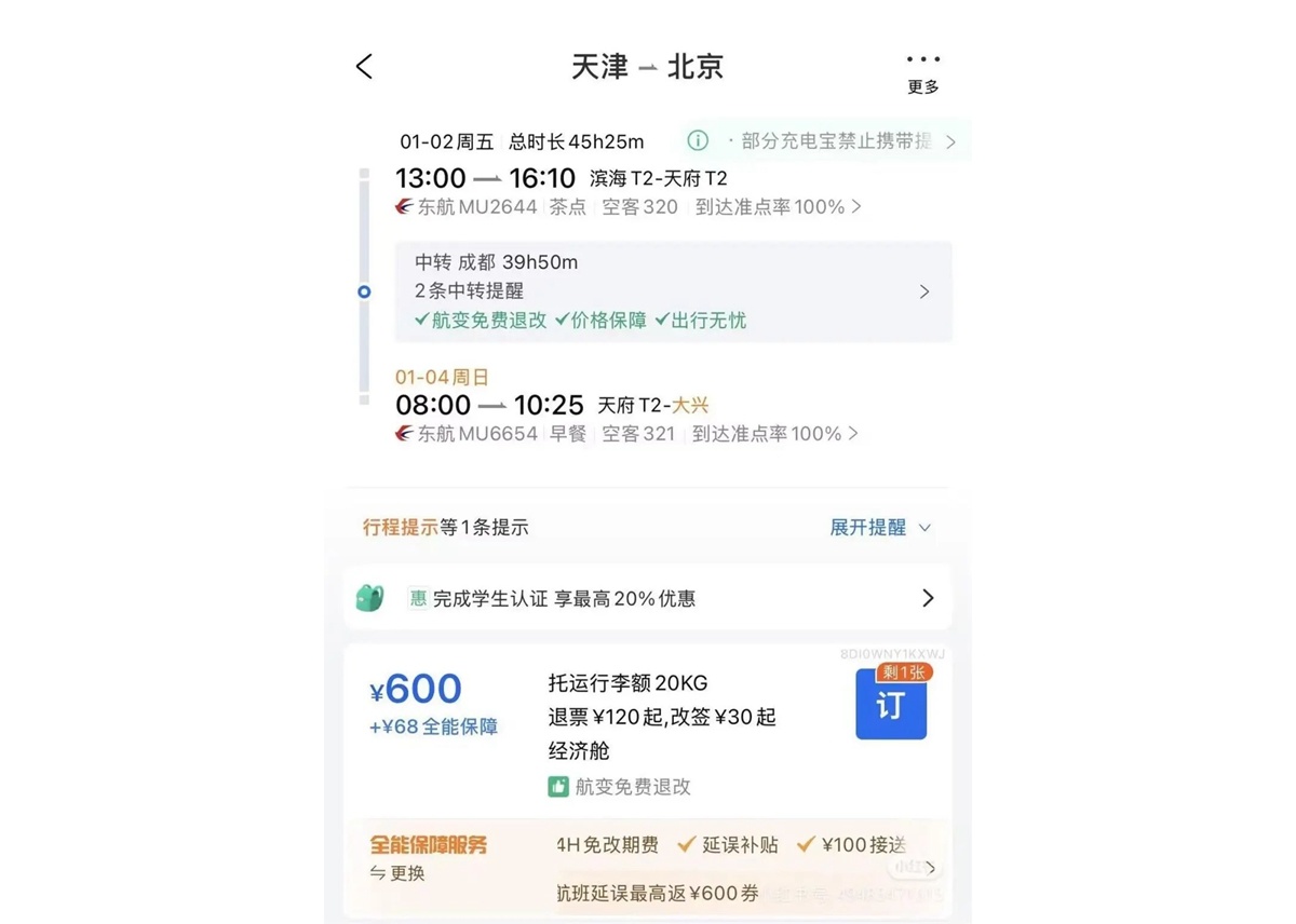 “回旋镖”机票最近又火了!只需600多元,购买明年1月2日从天津经成都中转再飞往北京的机票,中转的30多个小时内,就可以在成都的街头尽兴地走一走。飞到北京后,坐动车回天津也很方便。本月初,就有网友晒出购买“回旋镖”机票低成本游玩一座城的攻略。