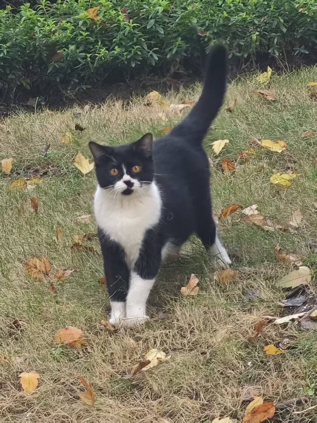 业主们介绍,等待领养的“黑猫警长”是一只奶牛猫,年龄九个月,性格比较活泼,有点胆小。
