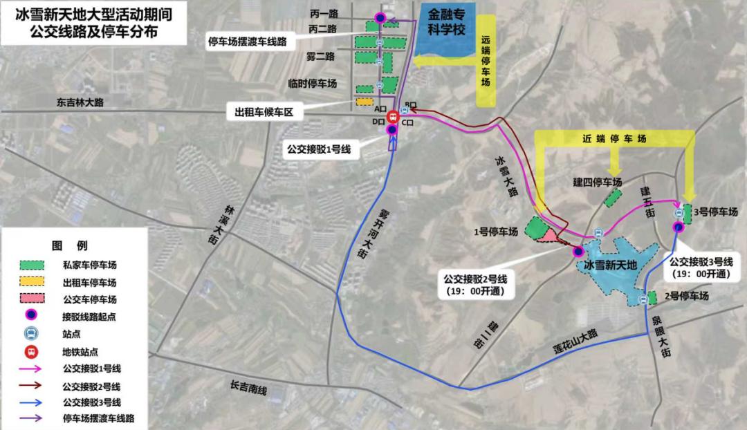 在冰雪新天地周边区域设有多个临时停车场,近端停车场趋于饱和,交管部门将对冰雪大路、泉眼大街、莲花山大路、天健路、雾开河大街等道路实施临时通行管控。其间,公交车辆优先通行,请自驾游客提前关注路况,合理规划行车路线,并配合现场交警交通管控。