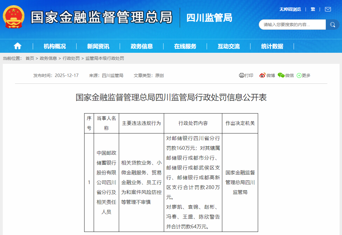 12月17日,四川金融监管局官网披露,因相关贷款业务、小微金融服务、贸易金融业务、员工行为及案件风险防控等管理不审慎的行为,四川金融监管局对邮储银行四川省分行罚款160万元;对其辖属邮储银行成都市分行、邮储银行成都武侯区支行、邮储银行成都高新区支行合计罚款280万元,对廖凯、袁锦、赵彬、冯春、王盛、陈欣警告并合计罚款64万元。