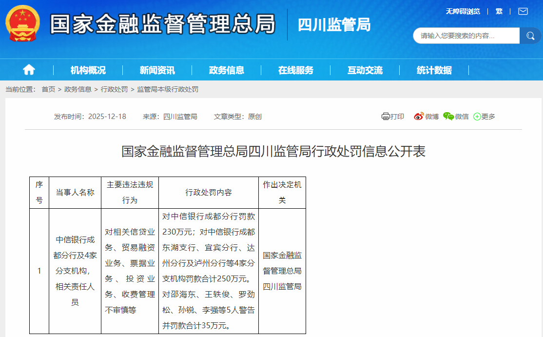 12月18日,四川金融监管局官网披露,因相关信贷业务、贸易融资业务、票据业务、投资业务及收费管理不审慎等行为,对中信银行成都分行罚款230万元。同时,对中信银行成都东湖支行、宜宾分行、达州分行及泸州分行等4家分支机构罚款合计250万元。此外,四川金融监管局还对邵海东、王轶俊、罗劲松、孙锐、李强等5人警告并罚款合计35万元。
