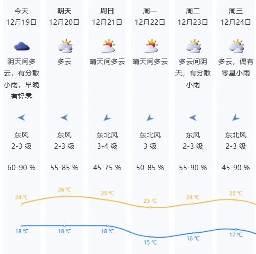 ▪ 今日(19日)阴天间多云,有分散小雨,早晚有轻雾;气温18-24℃;东风2-3级;相对湿度60%-90%。