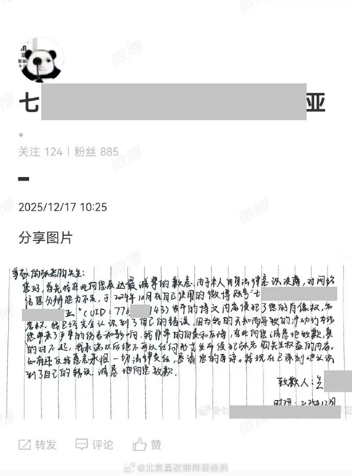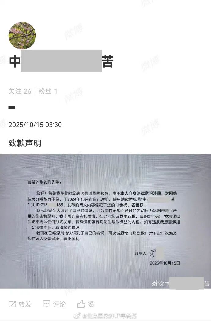 12月18日,@北京星权律师事务所 发文:2025年12月17日,由星权律师事务所代理的张若昀先生名誉维权系列案件,被告通过涉案网络账号向张若昀先生公开致歉。