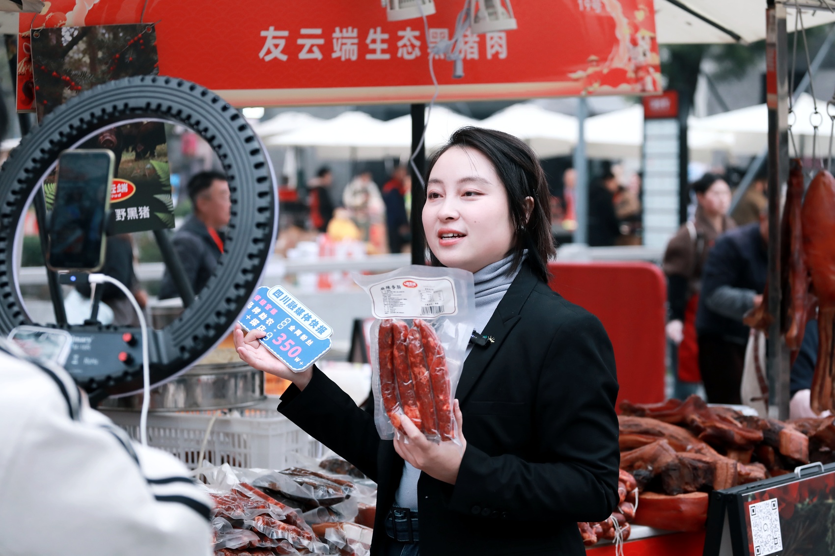线上直播间同样热度高涨,主播有的在试吃自贡冷吃兔,有的在推销生态黑猪肉,吸引众多网友踊跃互动。“看着就香!”“怎么买?”弹幕持续刷屏,精彩呈现出“云端品川味,一键购年货”的热闹场景。