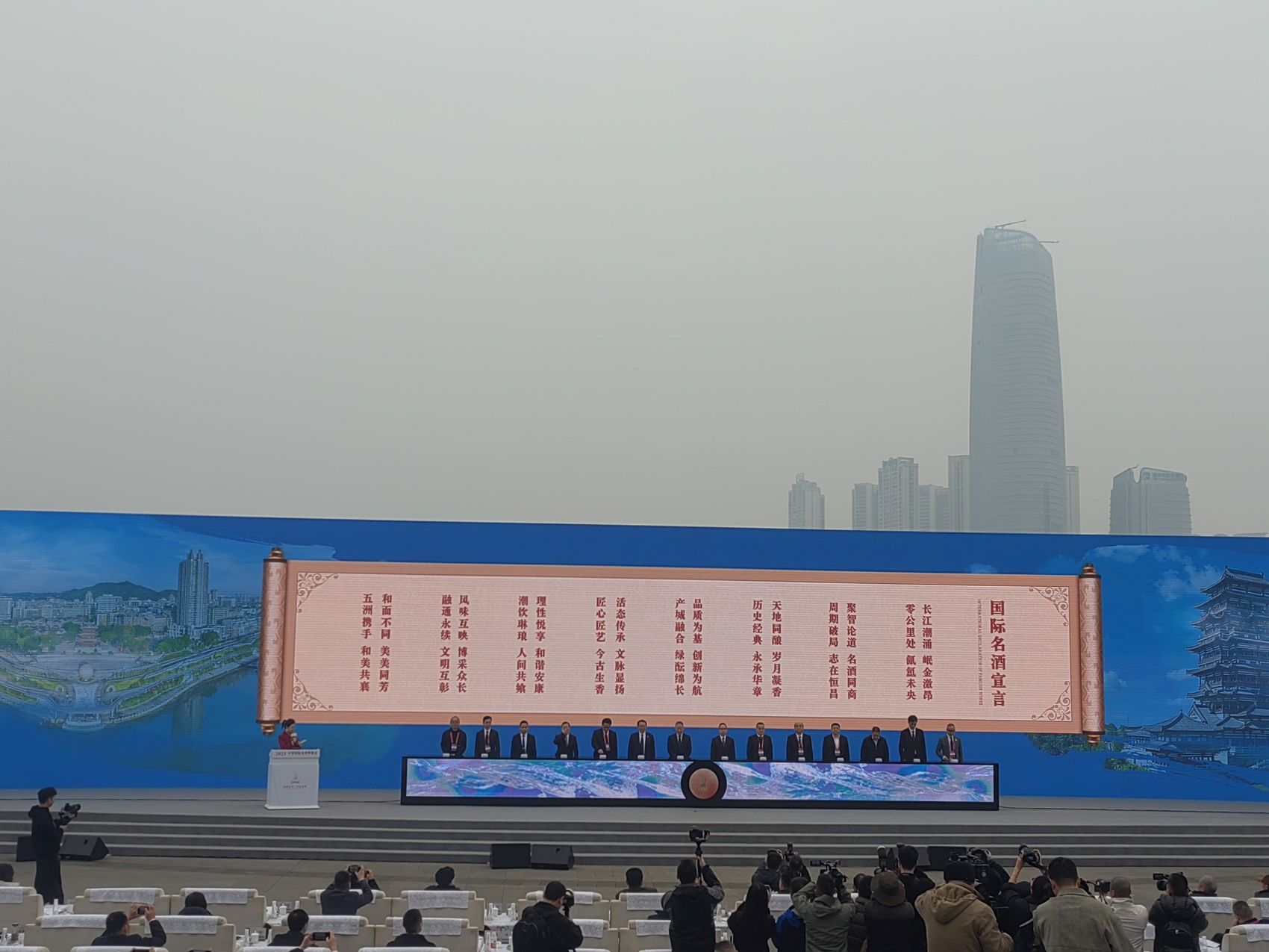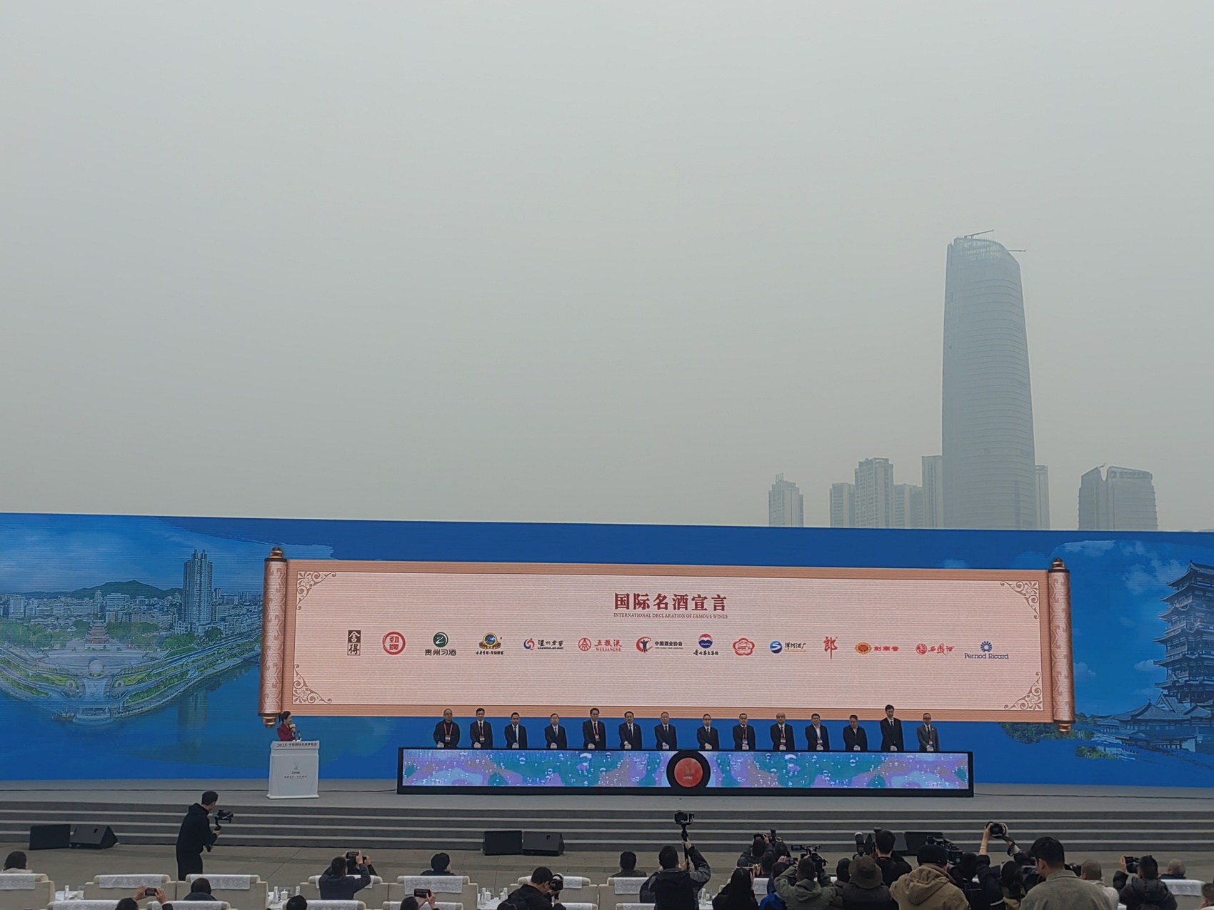 12月19日上午,宜宾合江门广场,在2025中国国际名酒博览会开幕式上,茅台、五粮液、泸州老窖、剑南春、洋河、郎酒、习酒等13家酒企联合发布《国际名酒宣言》。