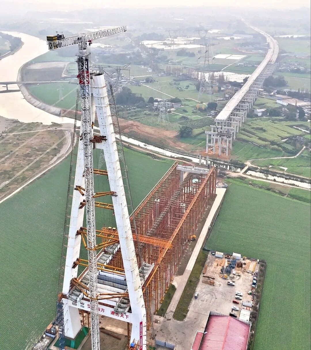 该桥主塔设计高度217米,采用钻石形钢壳混凝土组合结构,分38个节段施工,目前剩余7个节段施工正在推进中。“主塔建设预计在2026年1月初封顶,春节前开始桥面梁板吊装作业。”该标段现场副经理张俊杰表示。