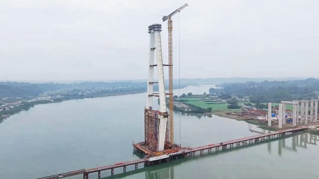 另一座虎渡溪岷江特大桥,已于今年10月初完成主塔封顶,目前进入梁板安装阶段。
