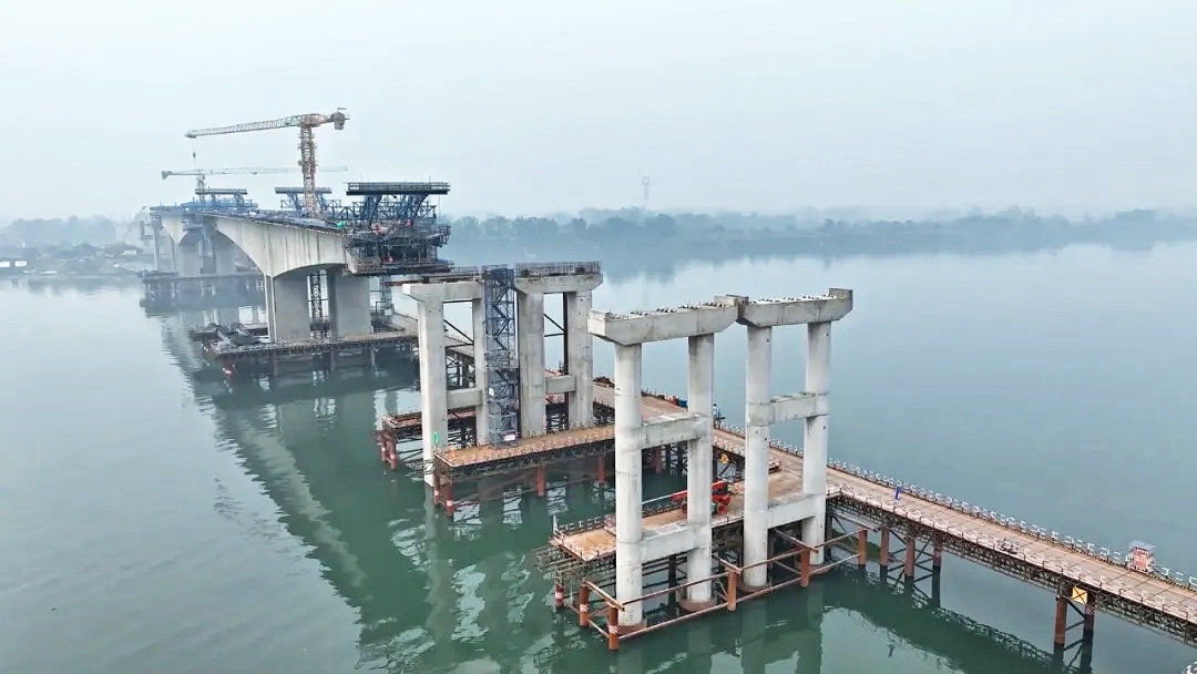 在青神岷江特大桥施工现场,施工人员正操作架桥机,有序进行梁板架设作业,这标志着该桥已完成主桥的下部结构施工工作,正式转入上部结构施工阶段。