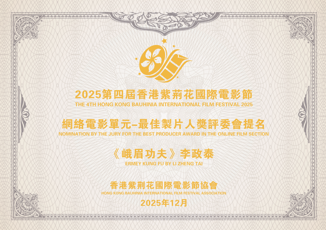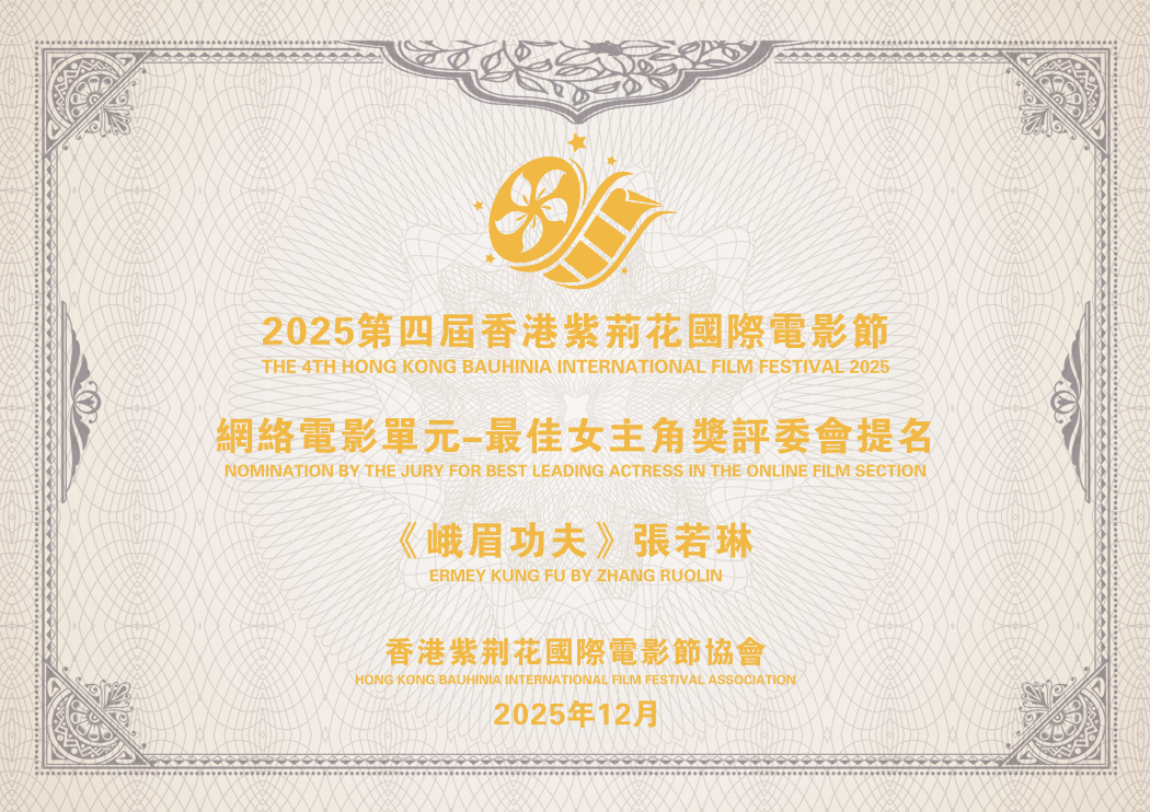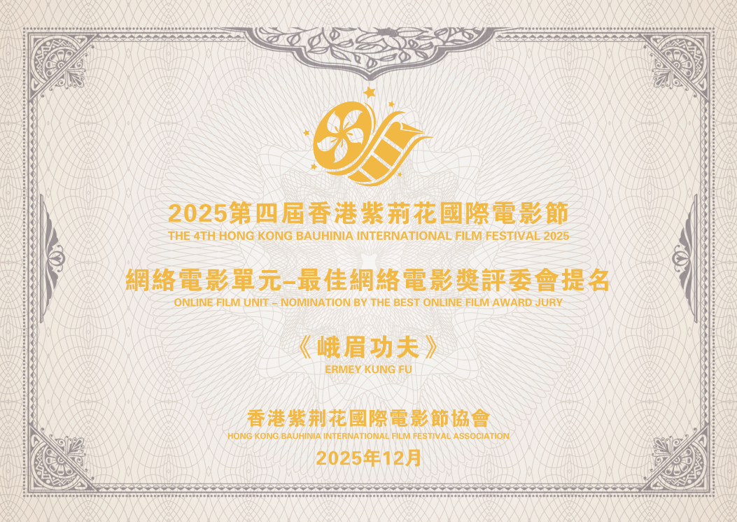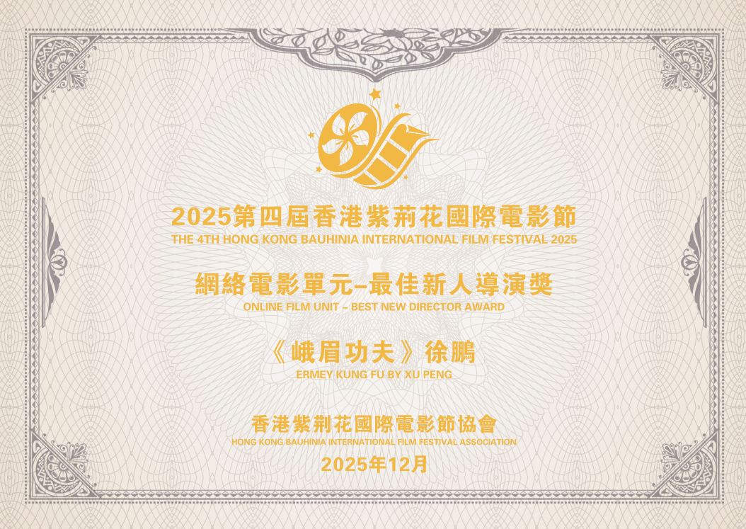 12月16日,在第四届香港紫荆花国际电影节上,《峨眉功夫》凭借深刻的主题表达与精湛的艺术呈现,荣获了本届电影节网络电影单元“最佳新人导演奖”,同时还获得了最佳女主角奖、最佳制片人奖、最佳影片奖提名。