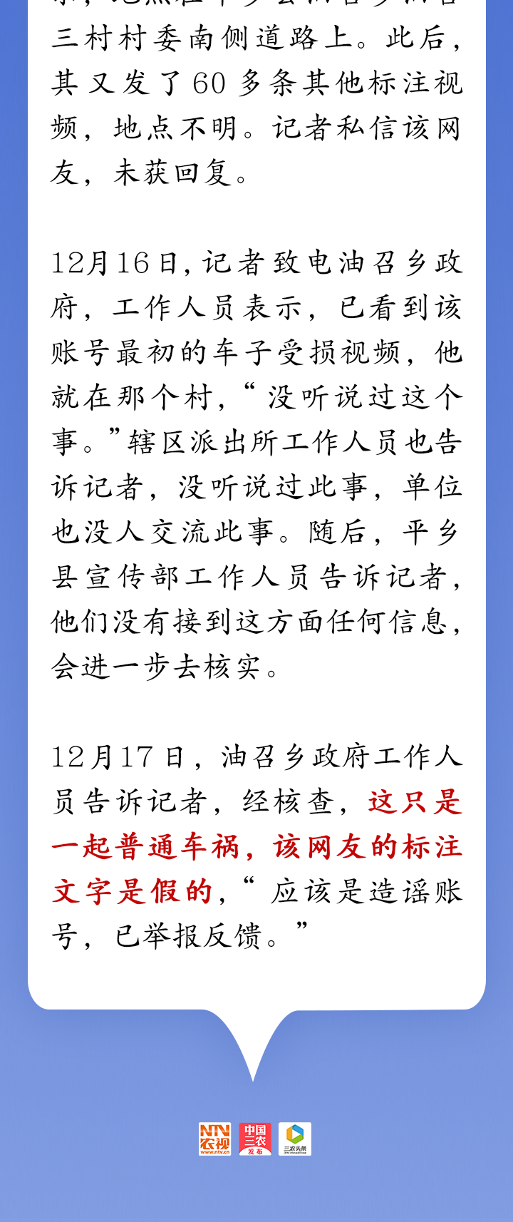 谣言止于智者,真相源于求证。中国三农发布推出《真相来了》专栏,每周聚焦热点事件、生活常识、科学知识等内容,让大家在信息的洪流中明辨真伪,共同营造清朗的网络空间。不造谣、不信谣、不传谣,人人有责!