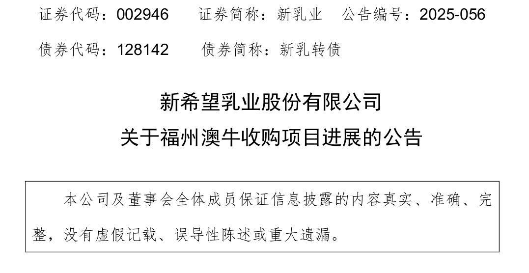 12月18日,新希望乳业股份有限公司(下称“新乳业”)公告,公司已完成福州澳牛收购项目的股权转让款支付。根据《投资合作协议》和《补充协议》的约定,交易各方一致确认收购新公司55%股权的交易对价为1.11亿元。截至2025年11月,公司已累计支付1.09亿元。近日,公司完成了剩余股权转让款231.46万元的支付。至此,福州澳牛收购项目已完成。