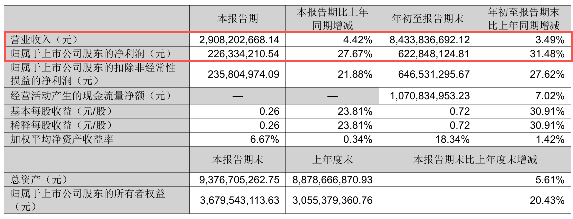前三季度业绩双增