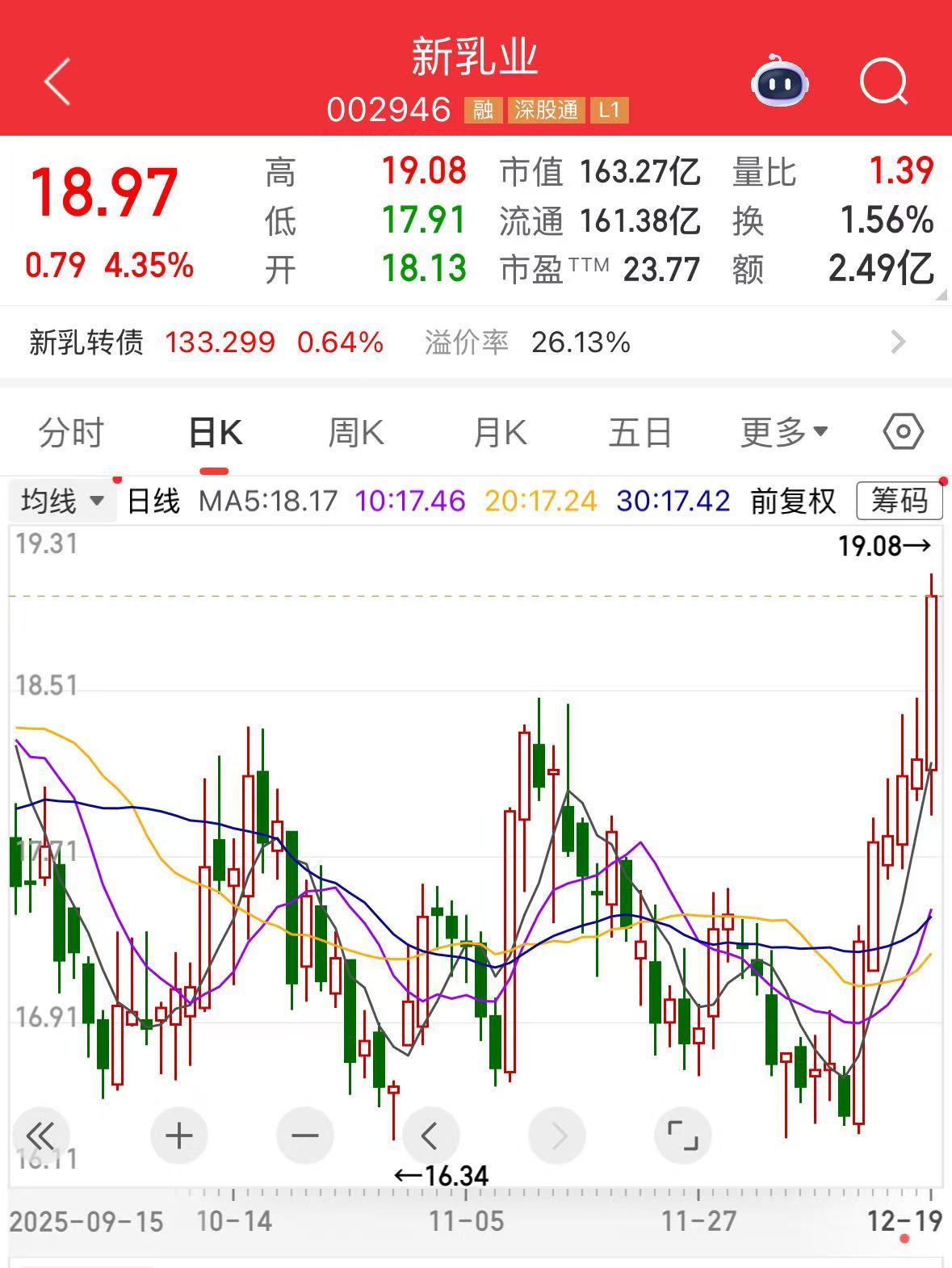 二级市场方面,截至12月19日收盘,新乳业报18.97元/股,总市值163.3亿元。
