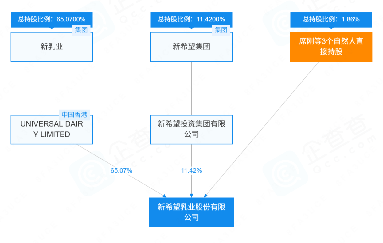 据了解,刘永好和刘畅父女是新乳业的实际控制人,也是一致行动人。截至发稿,由刘畅全资控股的Universal Dairy Limited(以下简称“UDL”),持有新乳业65.07%股份;刘永好全资控股新希望投资集团有限公司,持有新乳业11.42%股份,父女两人合计持股新乳业股份达到76.49%。