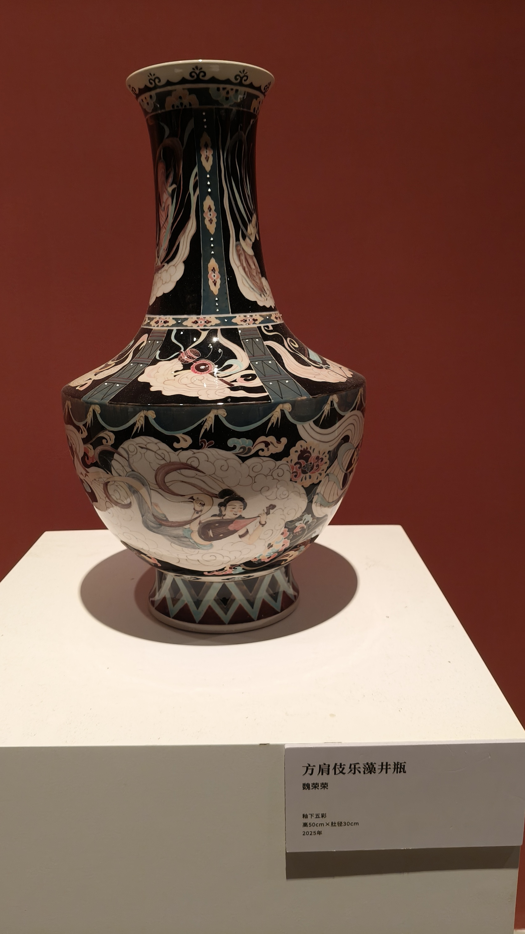 魏荣荣的《五彩伎乐葫芦瓶》以其独特的器型和绚丽的色彩成为展览的亮点之一。这件作品采用釉下五彩工艺,在传统的葫芦瓶上描绘了敦煌壁画中的乐舞场景。五位伎乐天各持不同乐器,姿态优美,仿佛随时会从瓶身飞出,奏响千年之前的梵音。