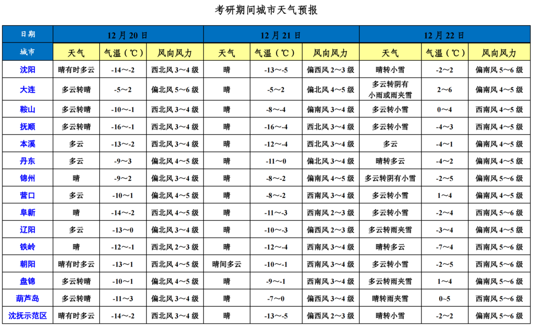 12月18日,辽宁省气象台发布考研期间(12月20日~22日)气象信息专报,预计考研期间,我省天气以晴为主;20日~21日东北部地区气温将下降6~10℃,其他大部地区下降4~6℃,21日早晨大连地区最低气温为-8~-3℃,北部地区为-16~-14℃,其他大部地区为-13~-9℃;22日白天中西部地区阵风可达7~8级。考研期间气温较低,体感较冷,建议考生做好防寒保暖工作。