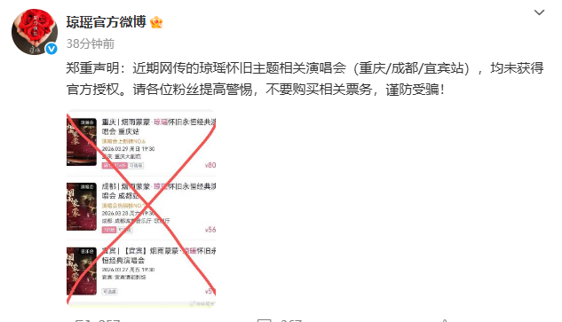 12月19日,琼瑶官方微博发布郑重声明:近期网传的琼瑶怀旧主题相关演唱会(重庆/成都/宜宾站),均未获得官方授权。请各位粉丝提高警惕,不要购买相关票务,谨防受骗。