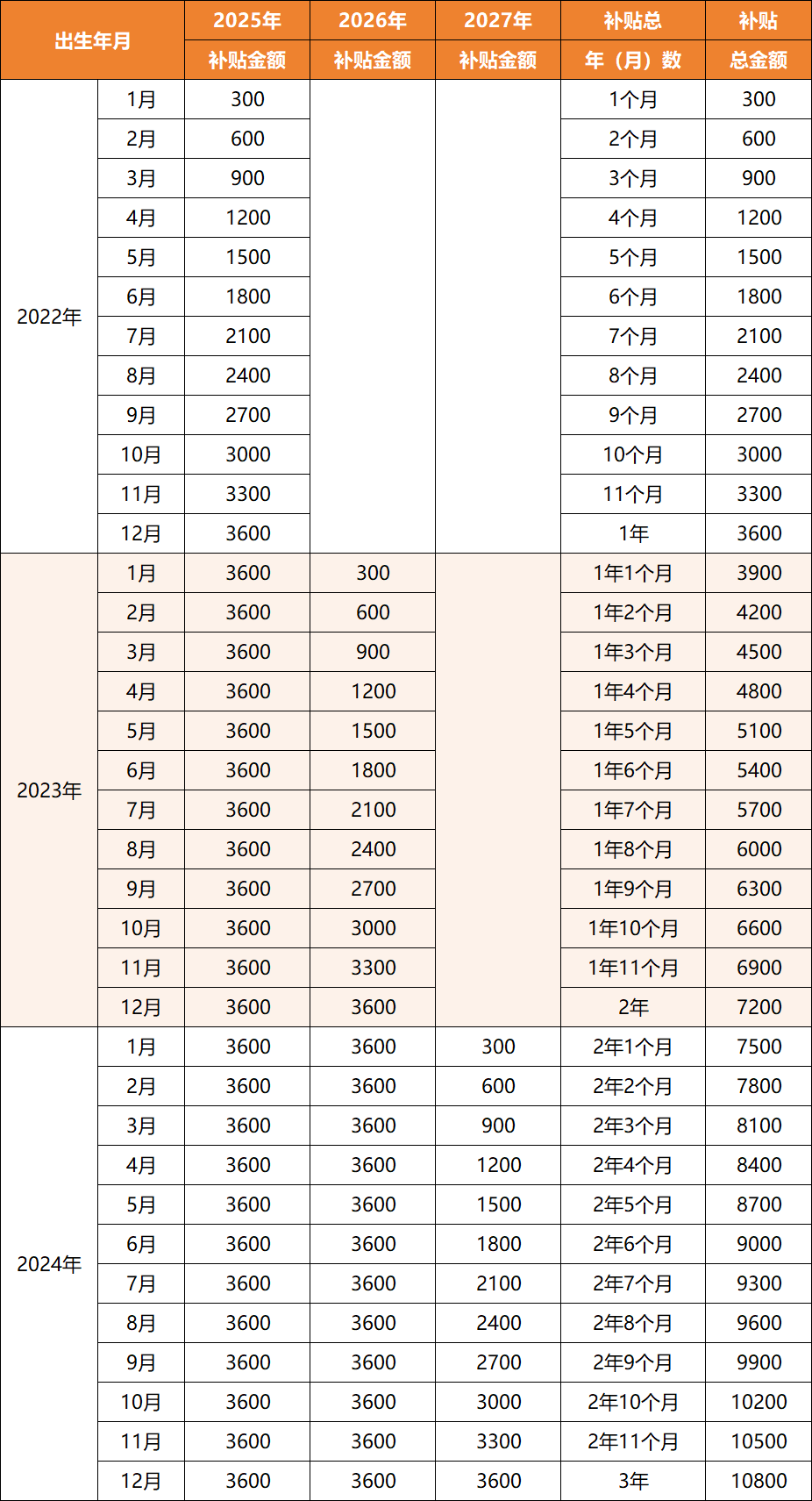 2.对于2025年1月1日前出生且未满3周岁的婴幼儿,可按应补贴月数折算补贴金额。具体算法见下表。