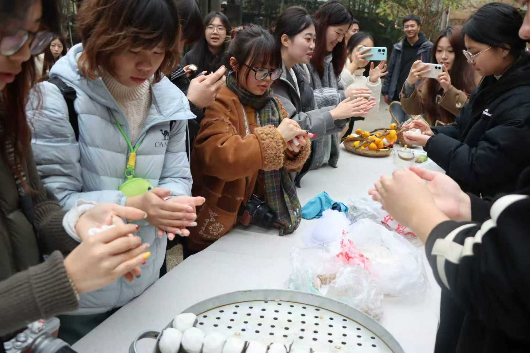 在徒步起点的崇州特色农产品体验区,汤麻饼、蜂蜜、香肠腊肉、大米等本地优质特产通过试吃、互动讲解等形式,让参与者直观感受崇州农业高质量发展新成果;穿行于牛尾笋林、暮光森林的天然氧吧中,茶园村的生态之美被师生们用镜头一一定格;在枇杷茶园,大家亲手体验制茶工艺、聆听茶产业发展故事,感受传统农业的匠心传承;古梨树采摘的野趣、秋水山房民宿的雅致风光,以及活动尾声充满烟火气的叶儿粑DIY,让参与者全方位沉浸式领略崇州乡村的自然禀赋、产业特色与民俗风情。