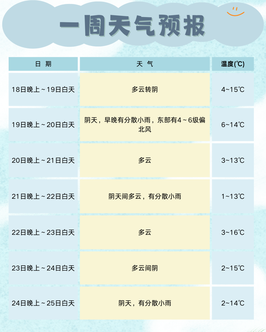 接下来一周弱冷空气活动频繁,冷空气影响时,20日、22日、25日成都云量明显增多,并有零星小雨的可能,冷空气过后1~2日,成都仍易出现晴空辐射,偶有辐射雾的可能。
