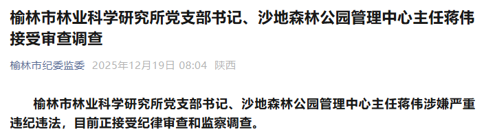 榆林市林业科学研究所党支部书记、沙地森林公园管理中心主任蒋伟涉嫌严重违纪违法,目前正接受纪律审查和监察调查。