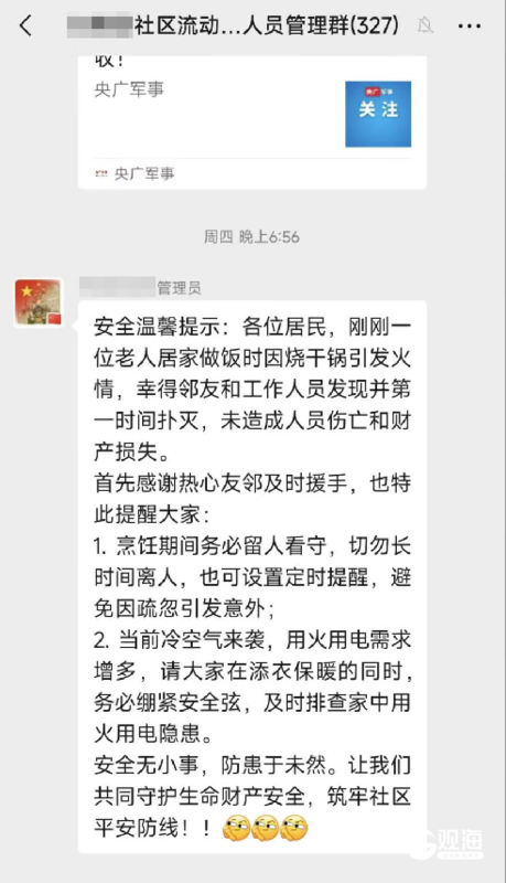 社区管理人员在社区群里对”友邻灭火”进行感谢的微信截图