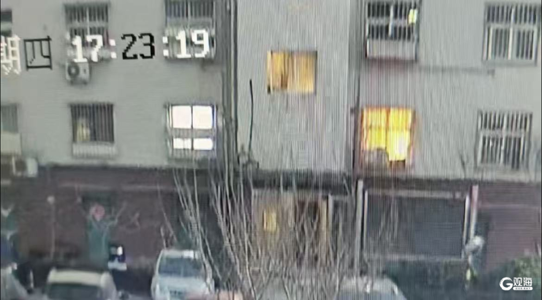社区居民楼火灾的监控截图:右侧明黄色的房间为起火房间