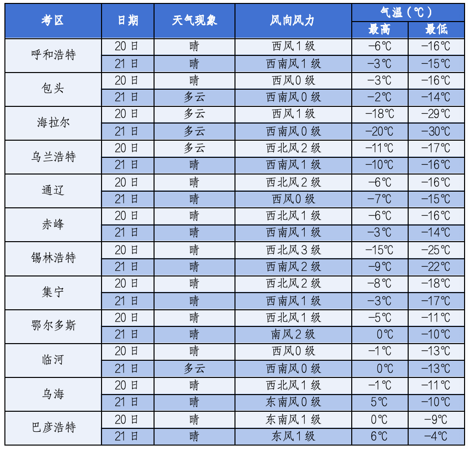 据中央气象台2025年12月19日发布“研考天气专报”,预计12月20日至21日内蒙古以晴为主。请广大考生和考务人员密切关注当天的天气情况,做好防寒保暖,关注道路积雪、结冰、湿滑对交通安全的影响,提早科学规划赴考出行路线。内蒙古各考区天气具体预报如下: