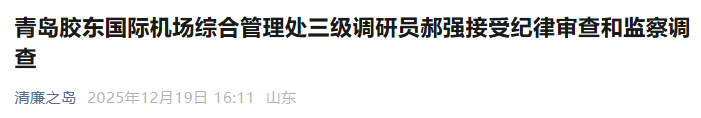 青岛胶东国际机场综合管理处三级调研员郝强涉嫌严重违纪违法,主动投案,目前正接受青岛市纪委监委纪律审查和监察调查。