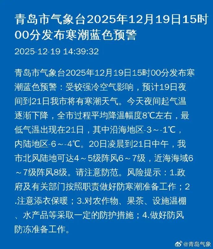 受较强冷空气影响,预计19日夜间到21日我市将有寒潮天气。今天夜间起气温逐渐下降,全市过程平均降温幅度8℃左右,最低气温出现在21日,其中沿海地区-3~-1℃,内陆地区-6~-4℃。20日凌晨到21日中午,我市北风陆地可达4~5级阵风6~7级,近海海域6~7级阵风8级。请注意防范。