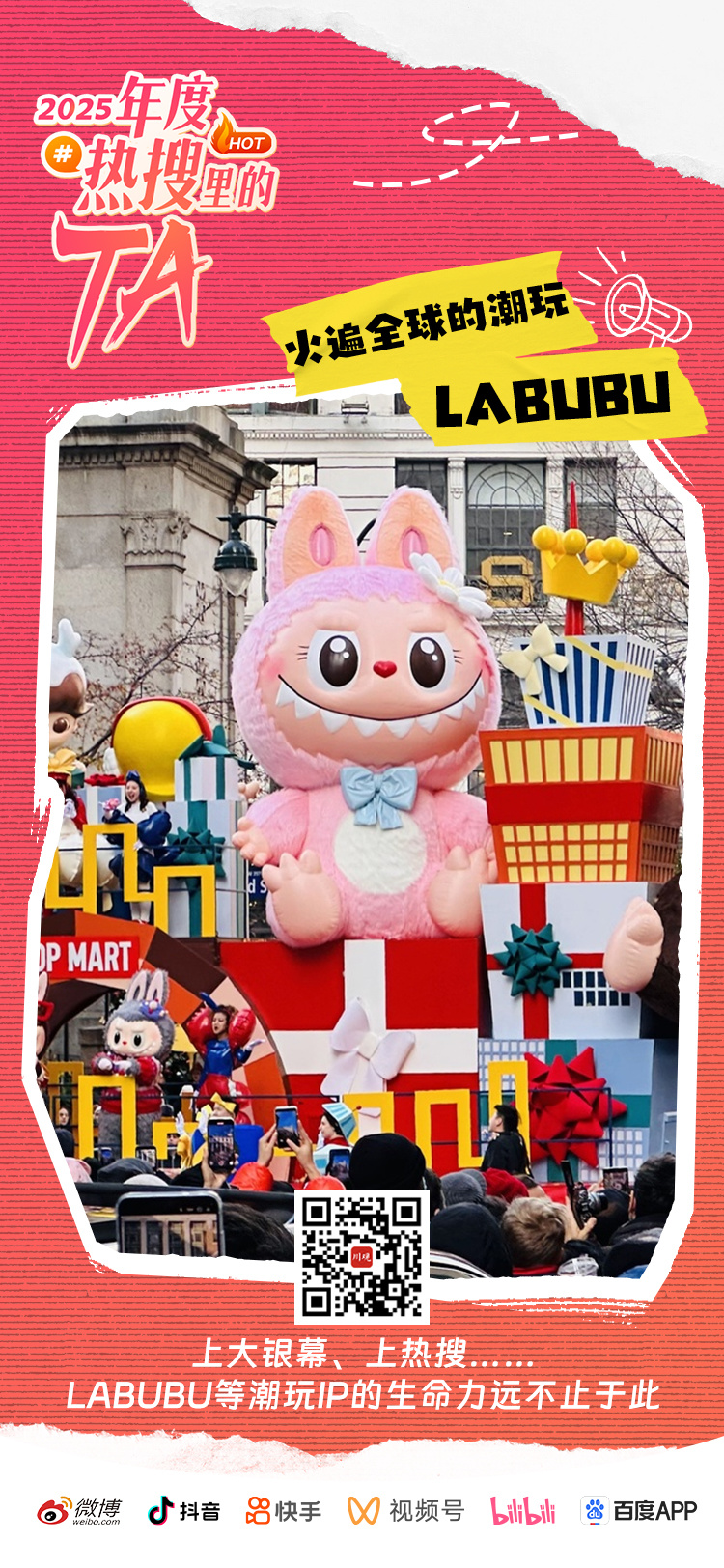 风靡全球的“LABUBU”,早已不只是一个盲盒。它登上纽约帝国大厦、亮相梅西百货感恩节大游行、被苹果CEO亲自打卡,甚至要拍电影了!从79元的小玩偶到百亿级IP,它承载的,是中国潮玩走向世界的野心与底气。