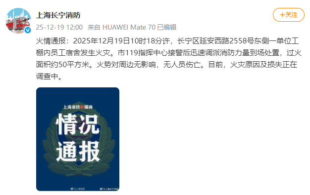 2025年12月19日10时18分许,长宁区延安西路2558号东侧一单位工棚内员工宿舍发生火灾。市119指挥中心接警后迅速调派消防力量到场处置,过火面积约50平方米。火势对周边无影响,无人员伤亡。目前,火灾原因及损失正在调查中。