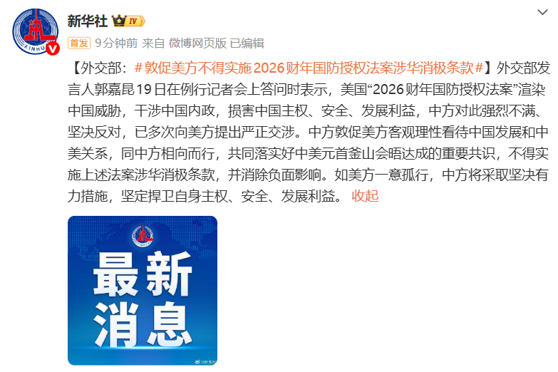 外交部发言人郭嘉昆19日在例行记者会上答问时表示,美国“2026财年国防授权法案”渲染中国威胁,干涉中国内政,损害中国主权、安全、发展利益,中方对此强烈不满、坚决反对,已多次向美方提出严正交涉。