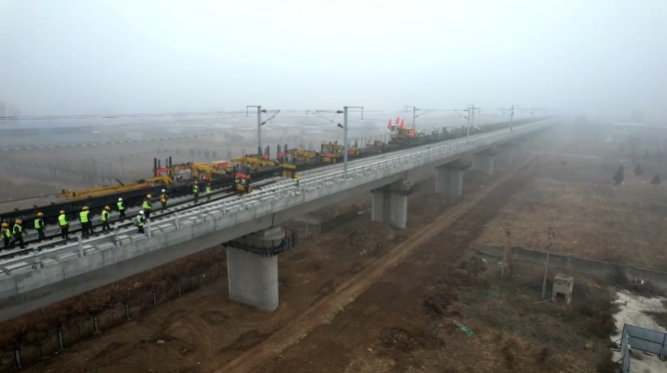 新华网讯:来自中国铁路北京局集团有限公司的消息:12月19日上午,在位于河北省邢台市清河县内的京港高铁雄商段铺轨施工现场,随着建设者将最后一对500米长钢轨平稳铺设就位,标志着京港高铁雄商段正线铺轨顺利完成,为线路按期开通运营奠定了坚实基础。