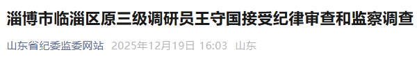 据淄博市纪委监委消息:淄博市临淄区原三级调研员王守国涉嫌严重违纪违法,目前正接受淄博市纪委监委纪律审查和监察调查。
