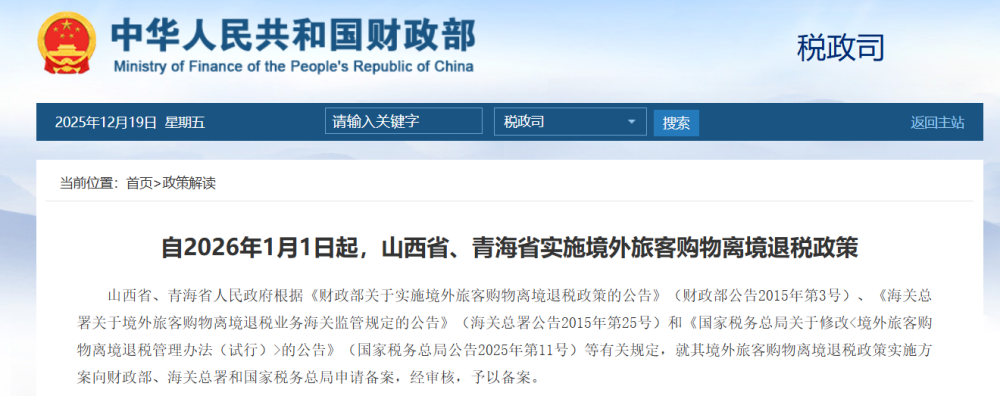山西省、青海省人民政府根据《财政部关于实施境外旅客购物离境退税政策的公告》(财政部公告2015年第3号)、《海关总署关于境外旅客购物离境退税业务海关监管规定的公告》(海关总署公告2015年第25号)和《国家税务总局关于修改的公告》(国家税务总局公告2025年第11号)等有关规定,就其境外旅客购物离境退税政策实施方案向财政部、海关总署和国家税务总局申请备案,经审核,予以备案。