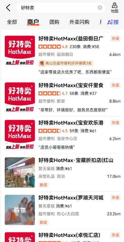 据大众点评搜索结果显示,好特卖在深圳有超50家门店。