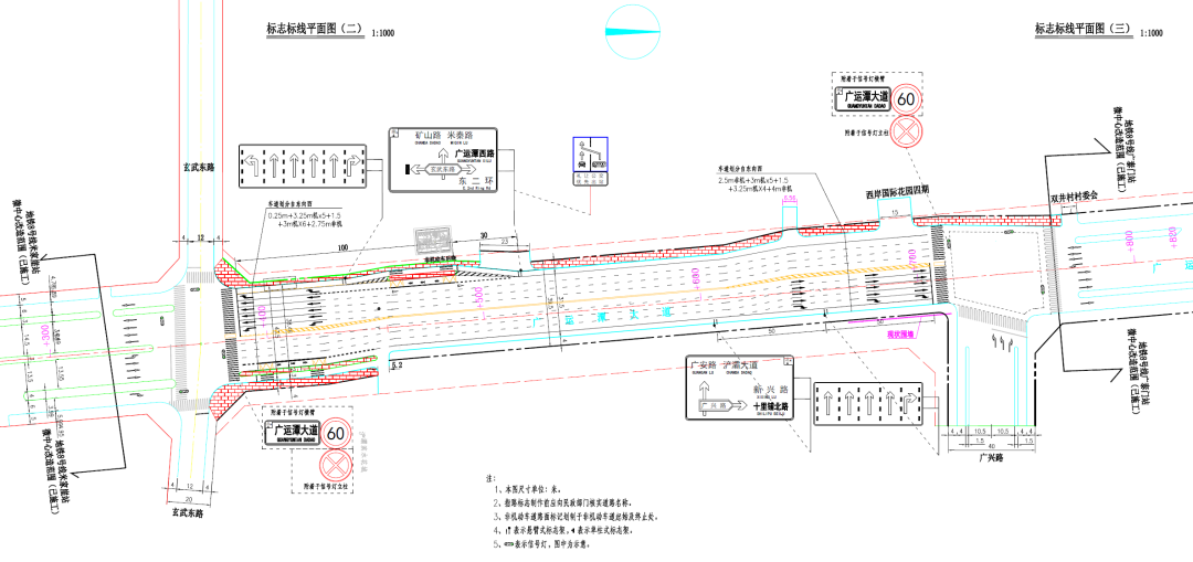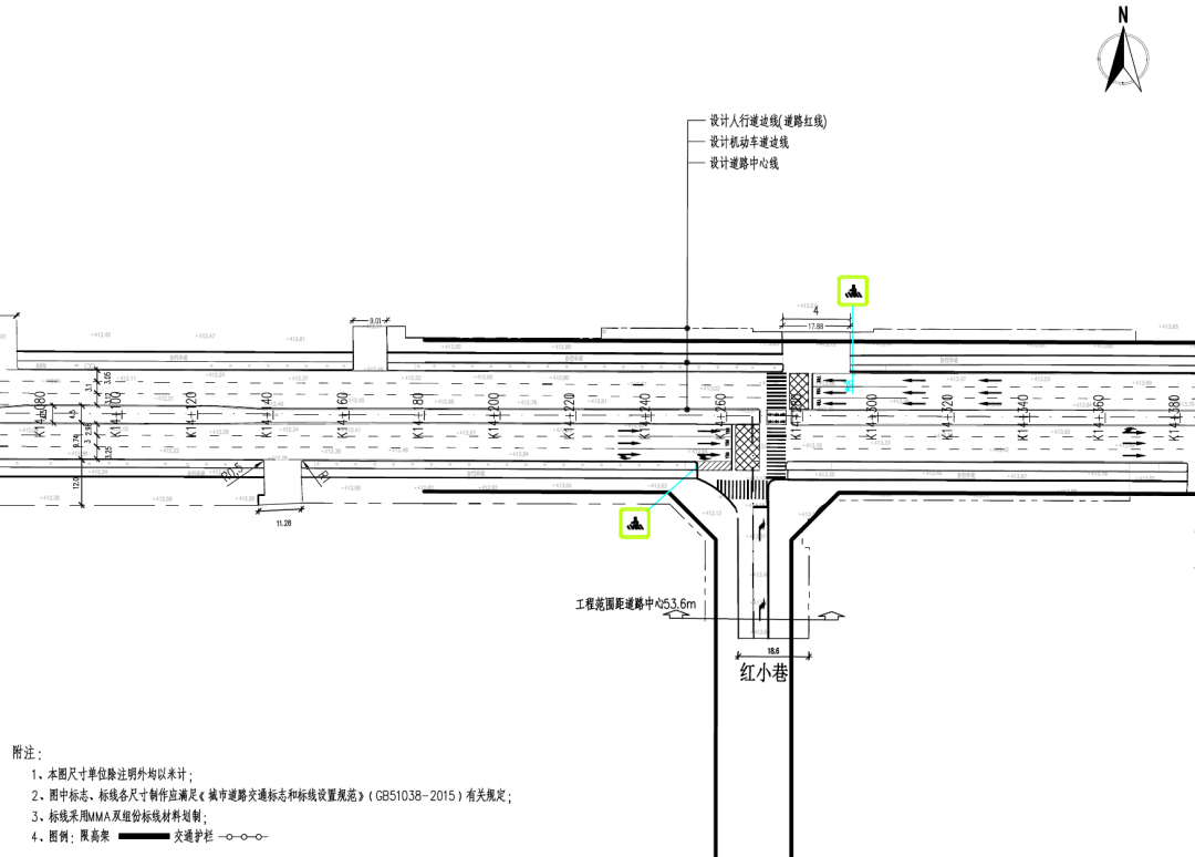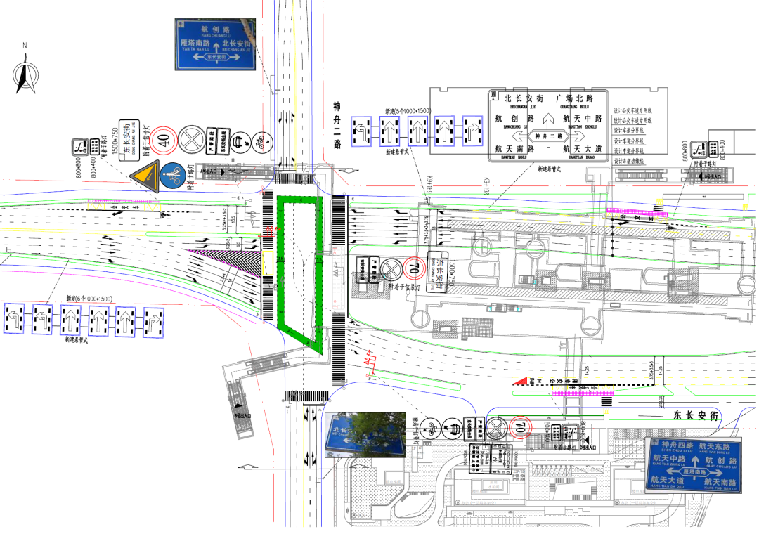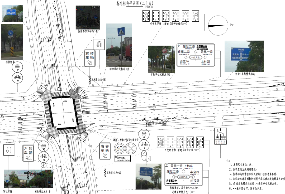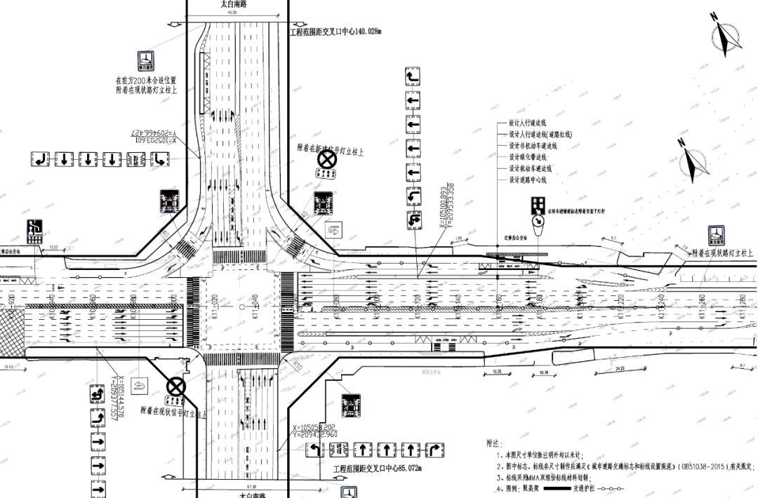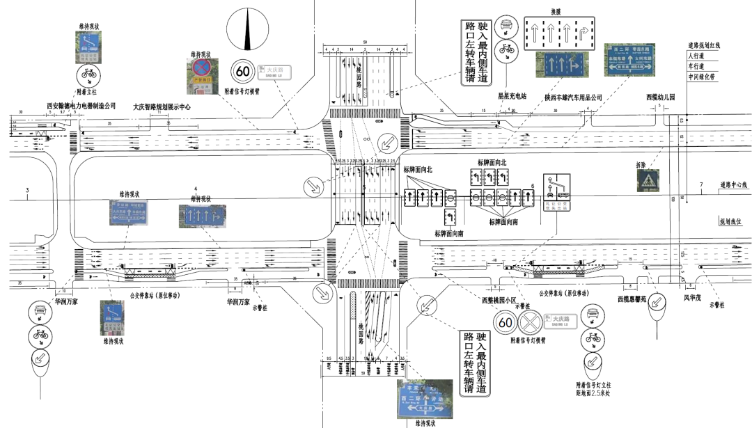 改造方案:实施南北向左转逆置交通组织方式;明确非机动车通行路权,完善相关交通标志标线。