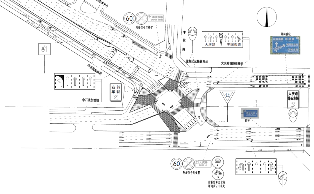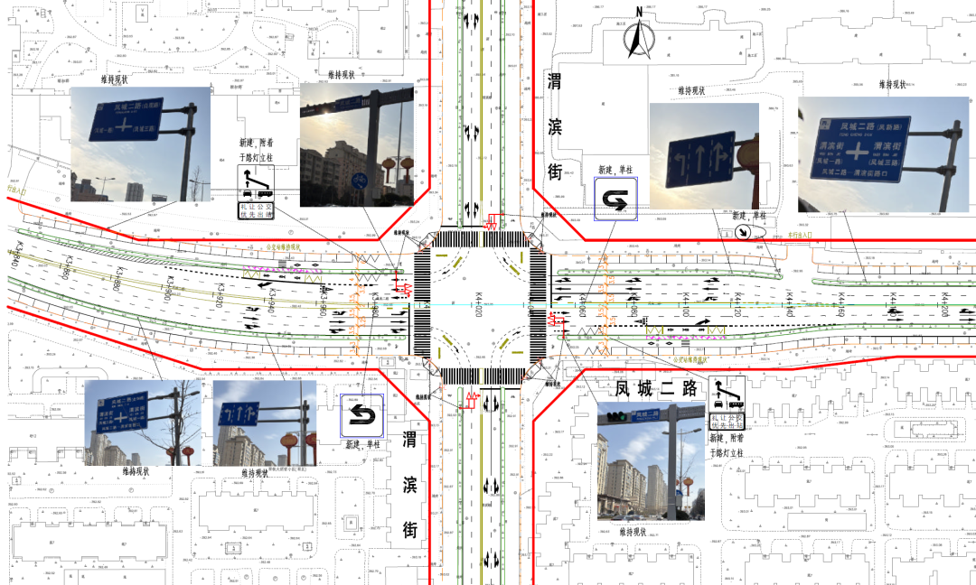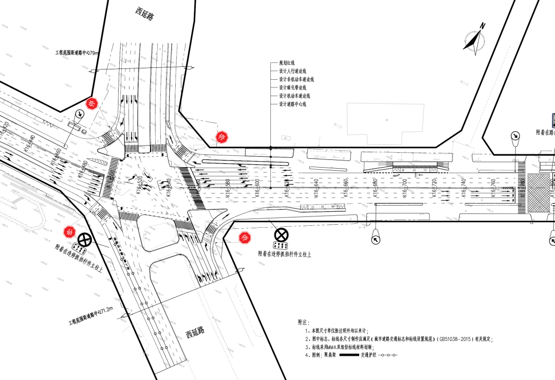 改造方案:调整西向东方向车道线形,保障车流连续通行;在北进口增设左转车道,拓宽东进口直行车道;完善慢行交通隔离设施与行人过街设施。