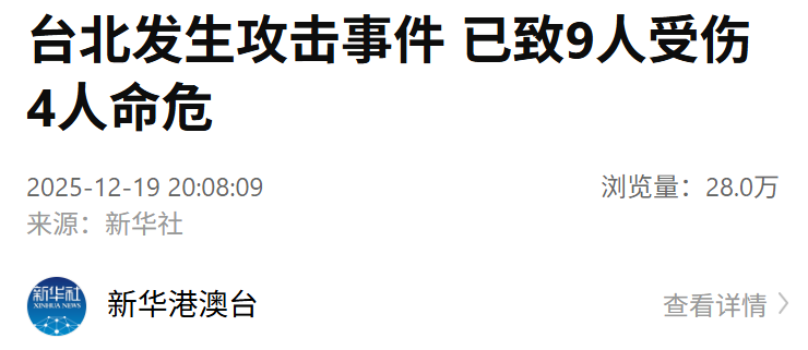 据台媒报道,台北车站19日下午5点30分左右发生攻击事件,一名男子戴有防毒面具,在台北车站出口附近投掷烟雾弹,1人送医时无生命迹象。该名嫌犯随后逃窜至地铁中山站,沿途丢掷烟雾弹,并持刀砍人。累计9人受伤,其中4人命危。